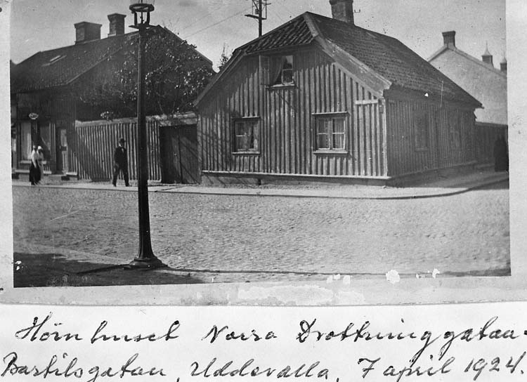 Text på kortet: "Hörnhuset Norra Drottninggatan, Bartilsgatan, Uddevalla. 7 april 1924".