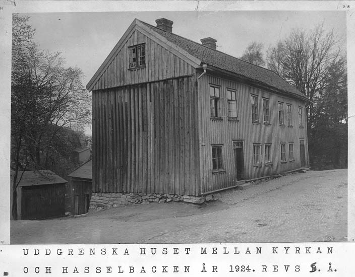 Text på kortet: "Uddgrenska huset mellan kyrkan och Hasselbacken år 1924."