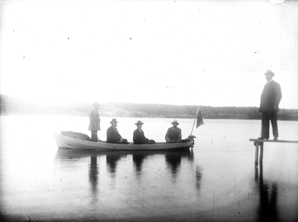 Text till bilden:"Fyra personer i båt med utombordare".
