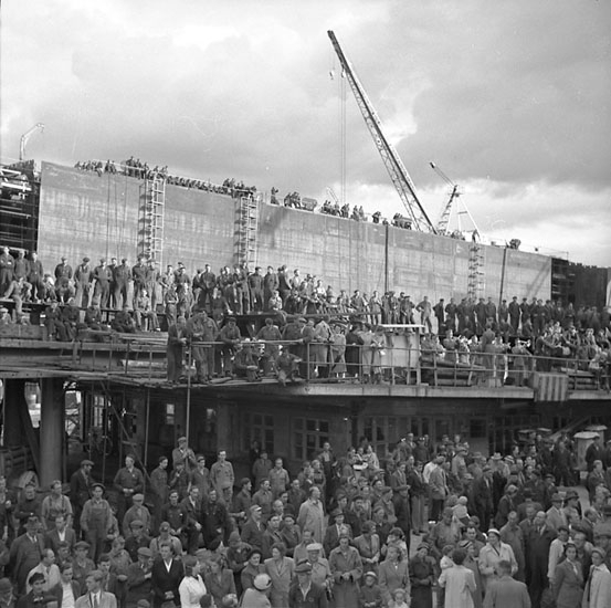 Inför sjösättning och dop av fartyg 114 M/S Hjördis Thordén.