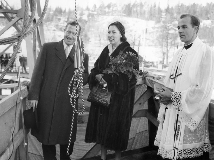 Vid dop och sjösättning av fartyg 125 M/S Point Lacre. Fartygets gudmor med en Uddevallavarvets representant.