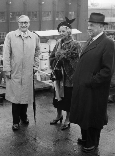 Från dop och sjösättning av fartyg 126 M/T Aslaug Torm. Mannen i ljus rock är redaren och Uddevallavarvets grundare Gustaf B. Thordén tillsammans med fartygets gudmor Fru C. Mazanti - Andersen och varvets dåvarande VD Olof Sahlin.