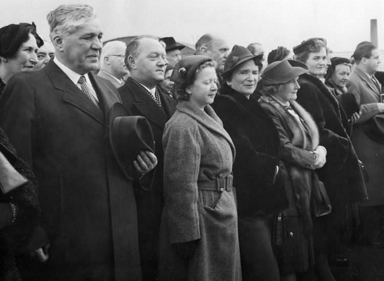 Från dop och sjösättning av fartyg 126 M/T Aslaug Torm. Uddevallavarvets dåvarande VD Olof Sahlin med hatten i hand.