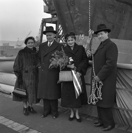 Dop och sjösättning av fartyget 131 M/T Bellami. Kvinnan med blombuketten är fartygets gudmor och till höger om henne står varvets VD Helge Hagelin.