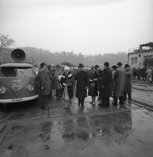 Dop och sjösättning av fartyget 136 M/T London Independence. Observera folkvagnsbussen.