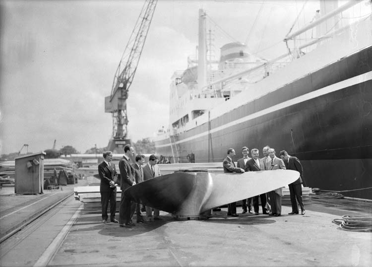Ryssbesök. Besökarna är samlade vid en propeller.