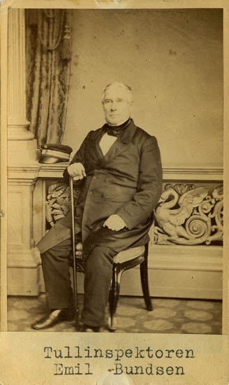 Text på kortets baksida: "Tullinspektoren Emil Bundsen, Lysekil. Född 18/5 1810 död 18/4 1889".