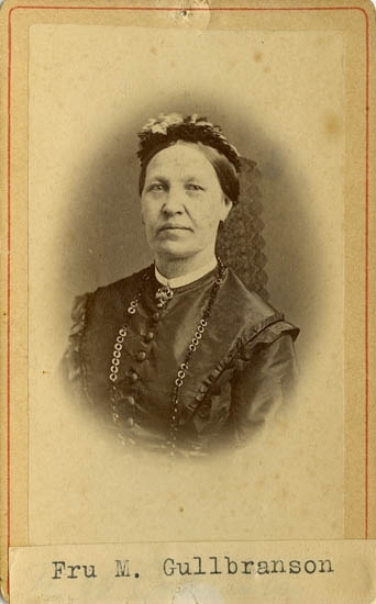Text på kortets baksida: "Fru Matilda Gullbrandson g. m. Sjötulls-Waktmästaren Nils Gullbrandson, Uddevalla. Död 1 maj 1876, 65 å 7 m 15 d".