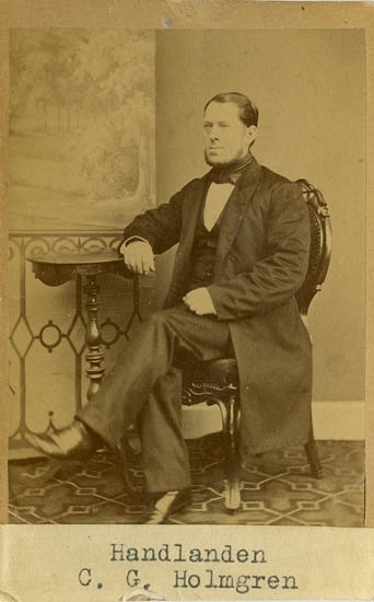 Text på kortets baksida: "Handlanden C. G. Holmgren, Död 1873".