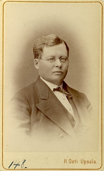 Text på kortets baksida: "Lektor i latin o grekiska vid Upsala h. allm. läroverk på 1860-talet. Blev sedan rektor i Enköping där han dog. Kallades "Laxen".