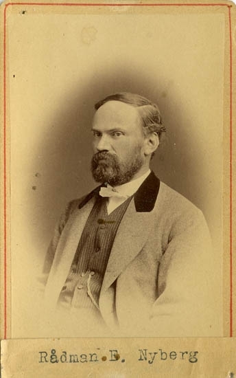 Text på kortets baksida: "Rådmannen Ernst Nyberg, f. 1834 d. 1921. Född i Örebro. Rådman 1867-1899 i U-a".