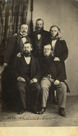 Text på kortets baksida: "Wall Komisarie Sundsvall, Karlberg telegrafingenjör jernvägen, Lunell Tg assistent Stockholm, Sjöqvist Tg assistent Stockholm, Lindström Tg assistent Stockholm".