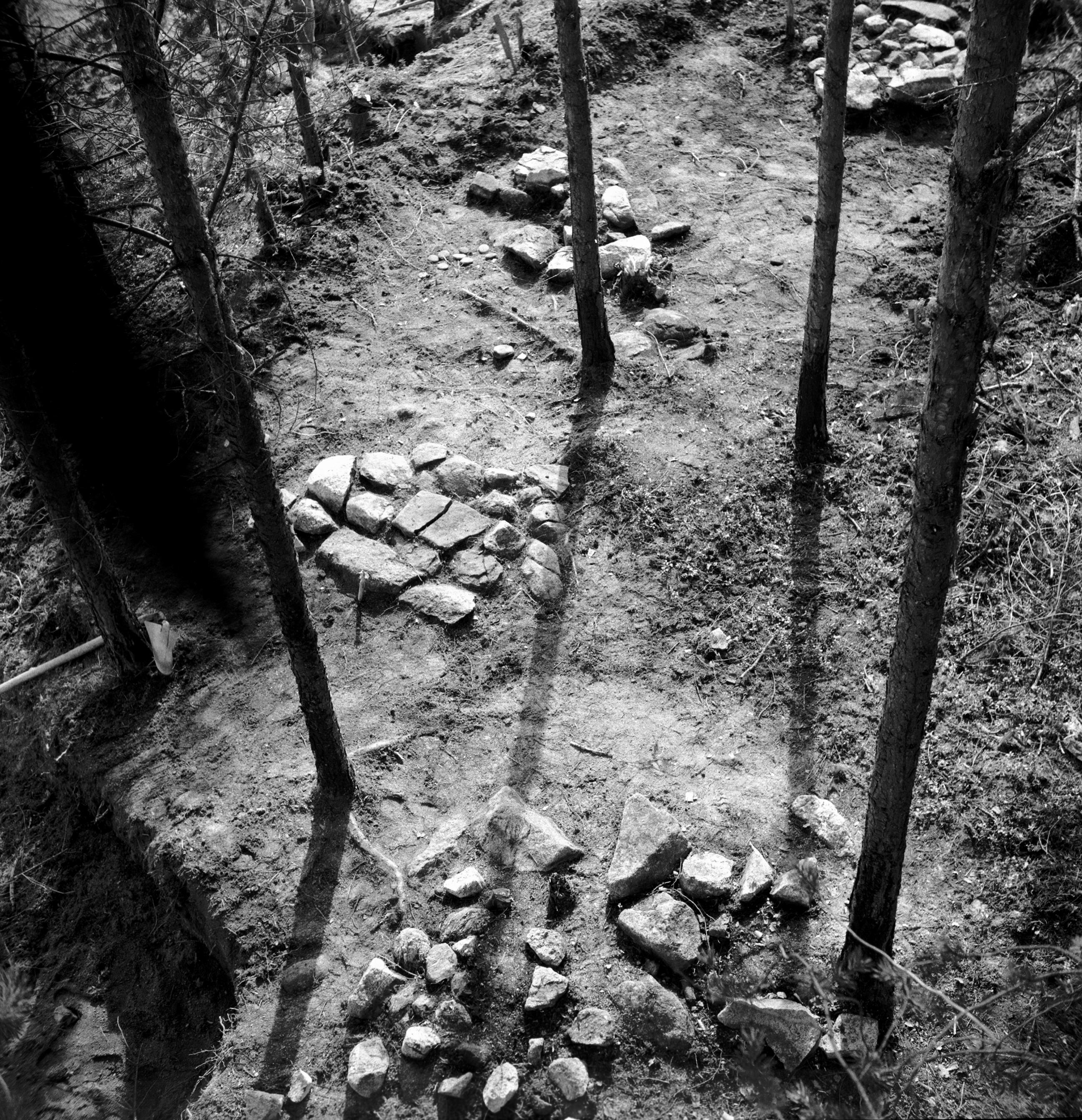 Stensele. Lokal 694. Härdarna 2, 3, 4 och 5 (nedifrån sett). Vid undersökningar 1954 träffade man på en ny boplatstyp med tydligt markerade härdar uppe på strandbrinken men helt utan skärvsten.