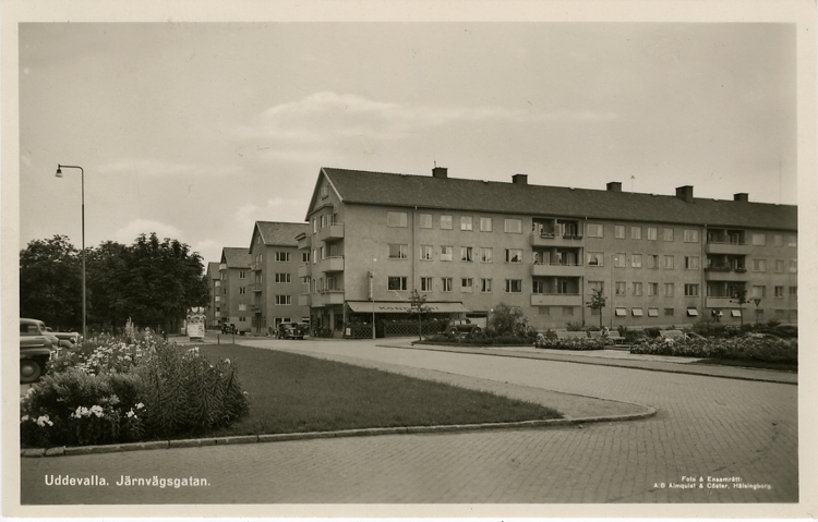 Tryckt text på vykortets framsida: "Uddevalla. Järnvägsgatan."