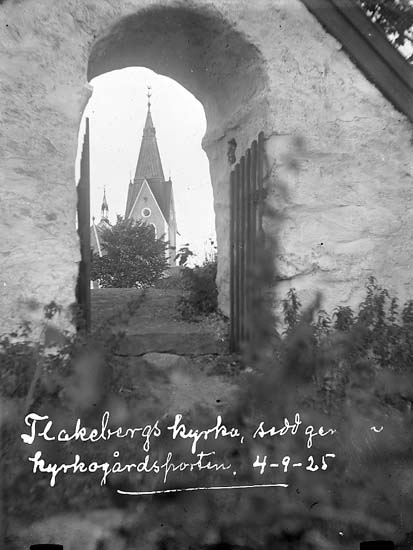 Enligt text på fotot: "Flakebergs kyrka sedd genom kyrkogårdsporten. 4-9-25".
