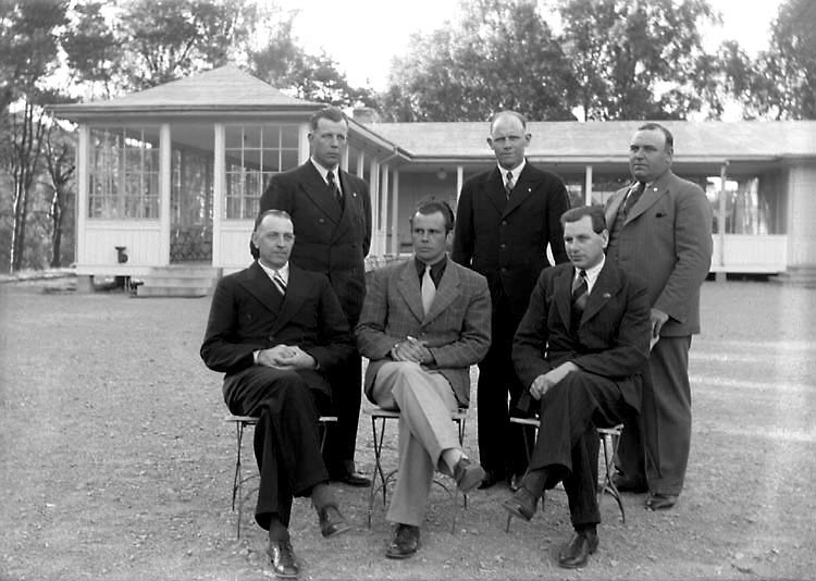 Enligt noteringar "Styrelsen för Munkedals Folkpark framför serveringsbyggnaden.