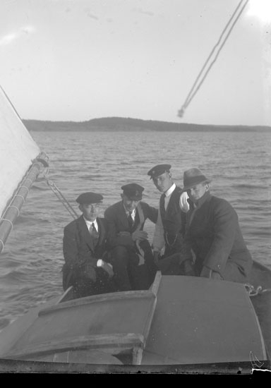 Enl. text i blå bok: "Fyra män i sittbrunnen på en segelbåt"