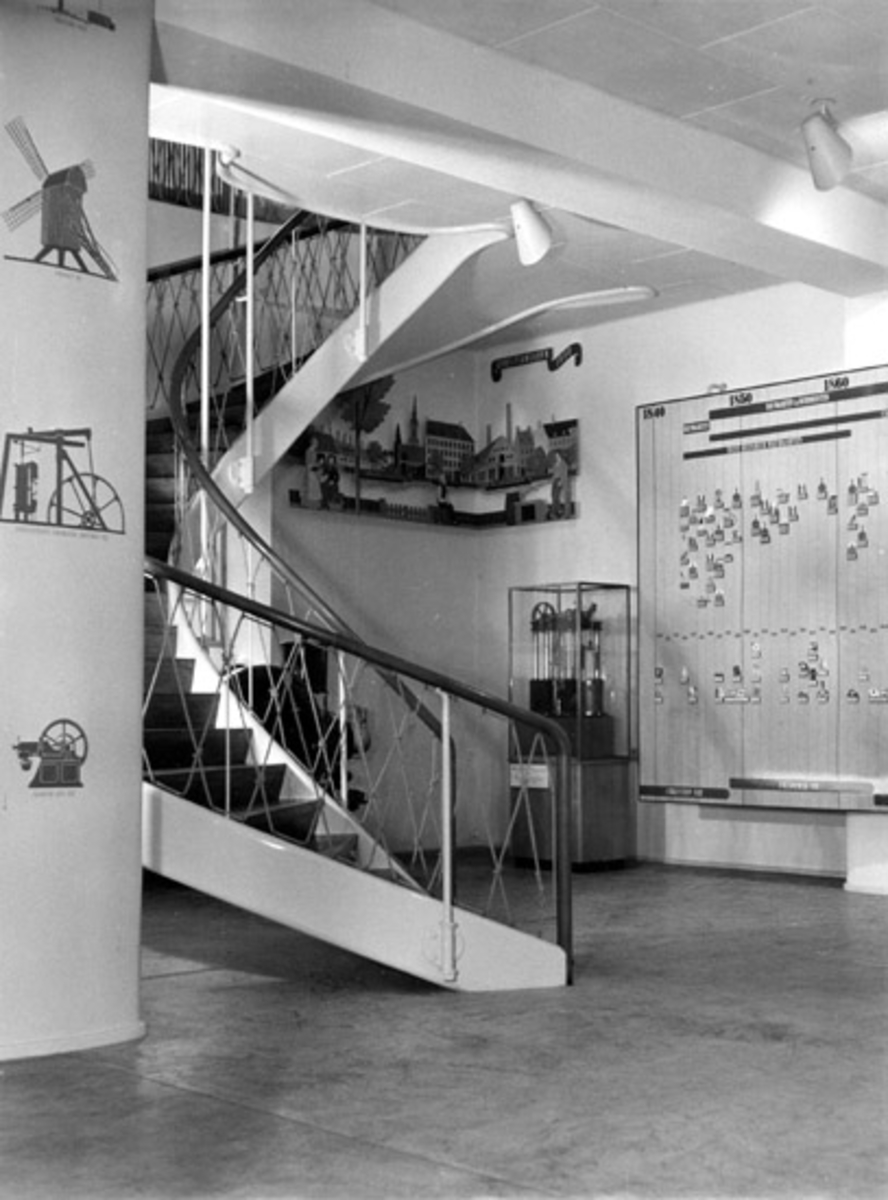 Skrivet på baksidan: Fra museets hall med den smukke trappe til förste etage. I baggrunden i montren en model af en Dampmaskine fra 1864 konstrueret af William Wain. Til venstre herfor et hjörne af den af Tegner Poul Säbye framstillede historiske tavle, som giver en oversigt over B & W´s udvikling siden 1843.