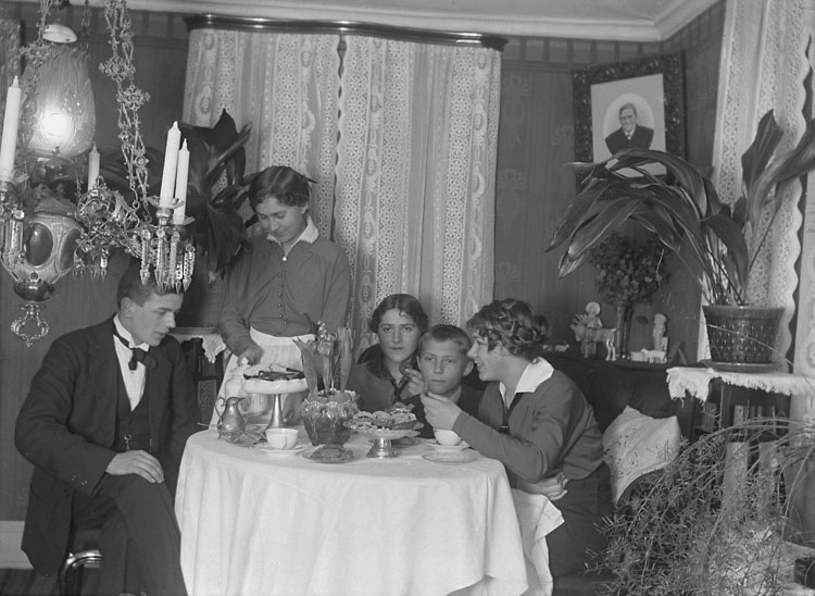 Enligt senare noteringar: "Ingrid Olsson, John, Ester och Ingrid Helgesson, Ego vid kaffebordet 3/2 1916."