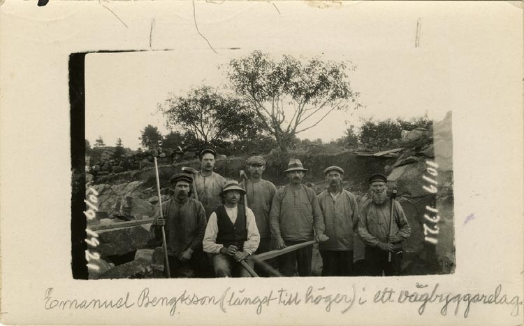 Handskriven text på vykortets framsida: "Emanuel Bengtsson (längst till höger) i ett vägbyggarelag."