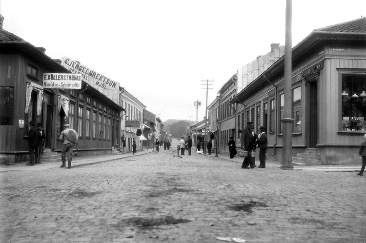"Uddevalla, N. Drottninggatan norrut från Wallströms hörna vid Kungsgatan."