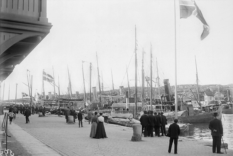 Nordisk Fiskeriutställning i Marstrand 1904. En lång rad båtar vid kajen längs Hamngatan.