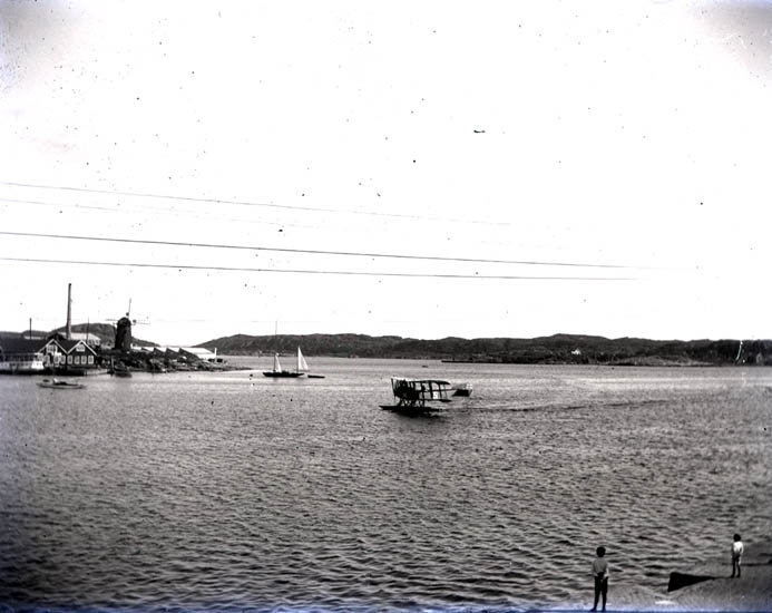 Färjan och en flygmaskin i hamnen. Den 18-19 Juli 1922. 4 st. Kopierade.
