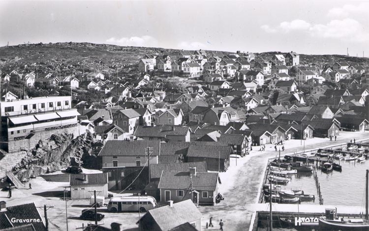 klar i inre delen, påbörjades 1935 klar 1939. Högst upp på Tjuvsundsberget i bakgrunden byggdes 1940 ett vattentorn. Kungshamnshotell t. v. byggt 1937".