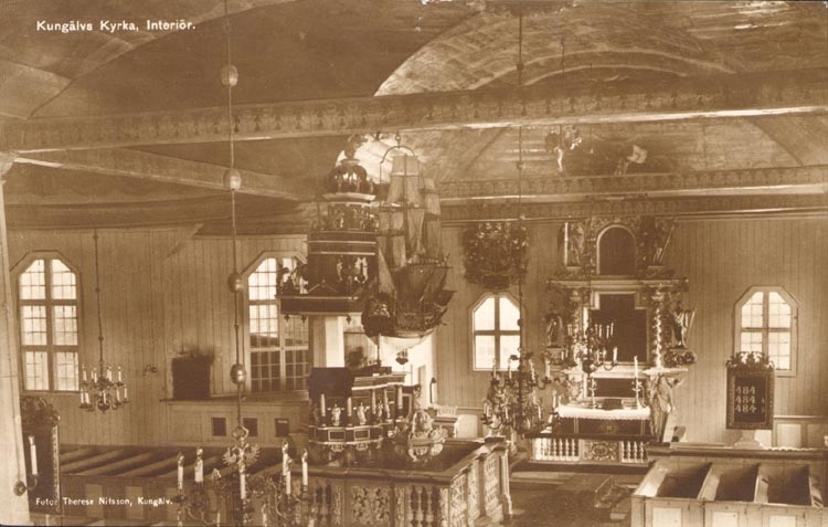 Tryckt text på kortet: "Kungälvs kyrka, Interiör".