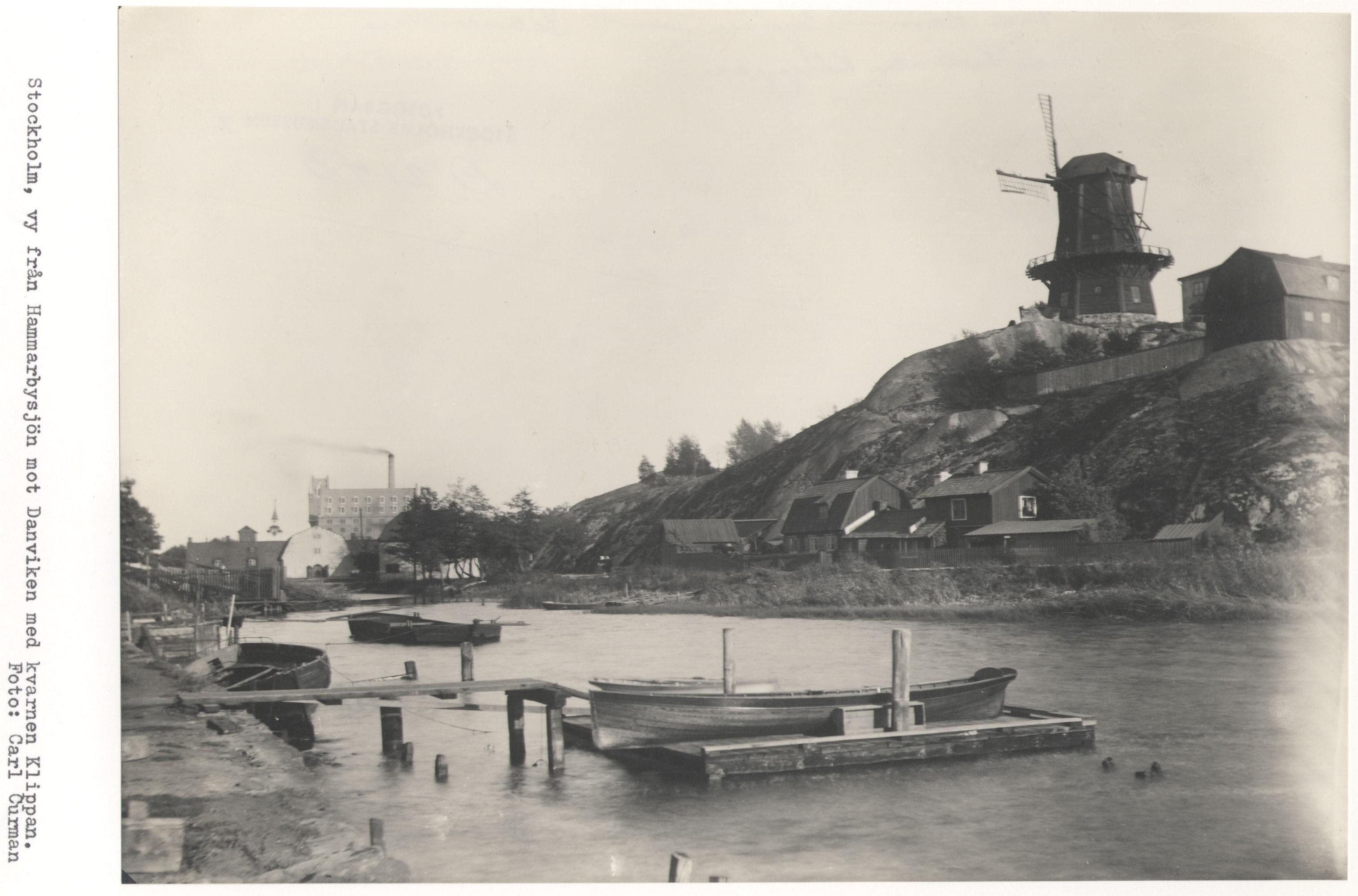 Vy från Hammarbysjön mot Danviken med kvarnen Klippan.