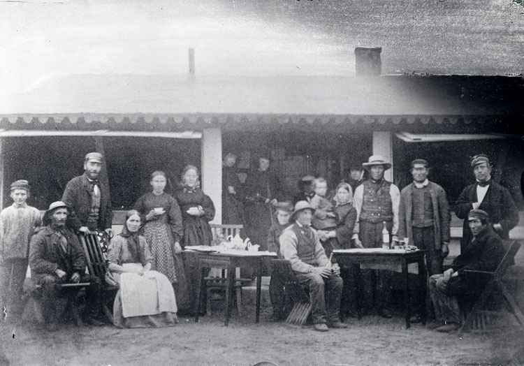 Badhuspersonal samlade runt ett kaffebord och ett brännvinsbord år 1862