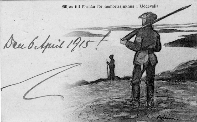 Tryckt text på vykortets framsida: "Säljes till förmån för hemortssjukhus i Uddevalla."