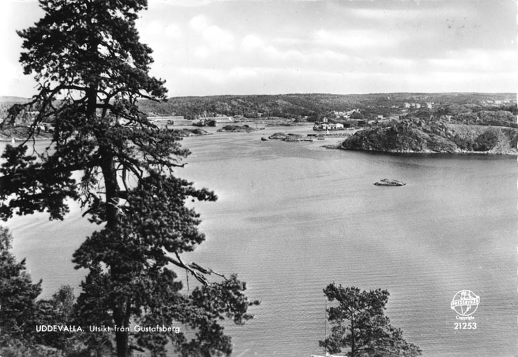Tryckt text på vykortets framsida: "Uddevalla; Utsikt från Gustafsberg."