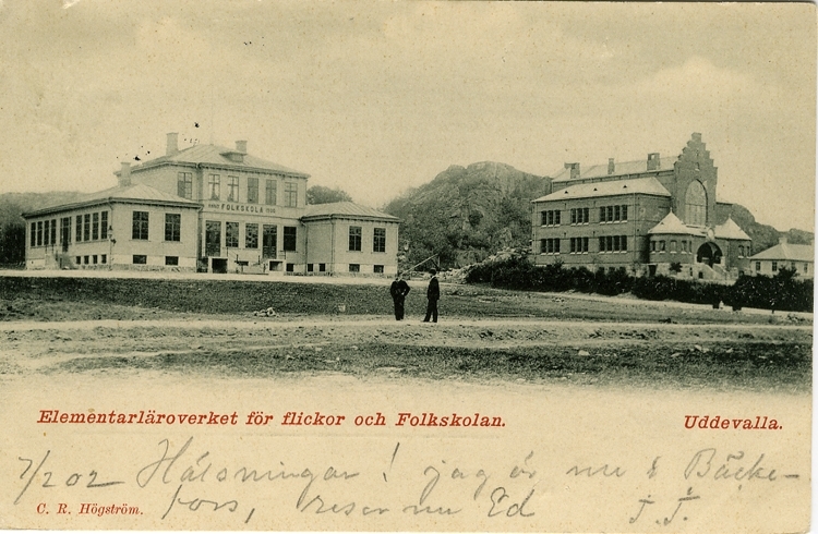Tryckt text på vykortets framsida: "Elementarläroverket för flickor och Folkskolan. Uddevalla."