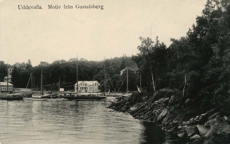 Tryckt text på vykortets framsida: "Uddevalla Motiv från Gustafsberg."