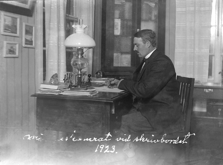 Enligt notering: "Reskamraten vid skrivbordet 1923, Jonas Andersson, Möve".