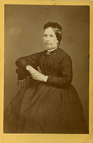 Text på kortets baksida: "Lina Bruhn, innehavare av Stadshotellet. F. 1812 död 1884".