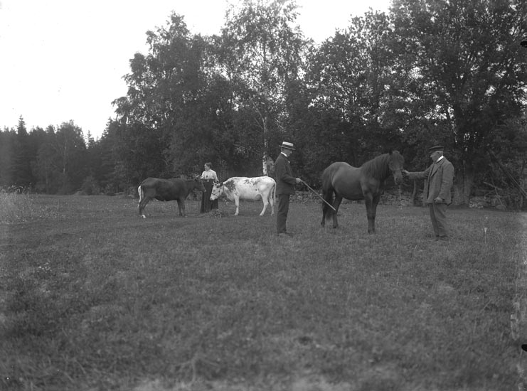 Enligt fotografens noteringar: "Troligen Fulltaga Skredsvik..... Mor Charlotta med två kor. Två herrar med häst.