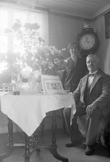 Man och kvinna poserar framför fotografen i en vrå av finrummet.