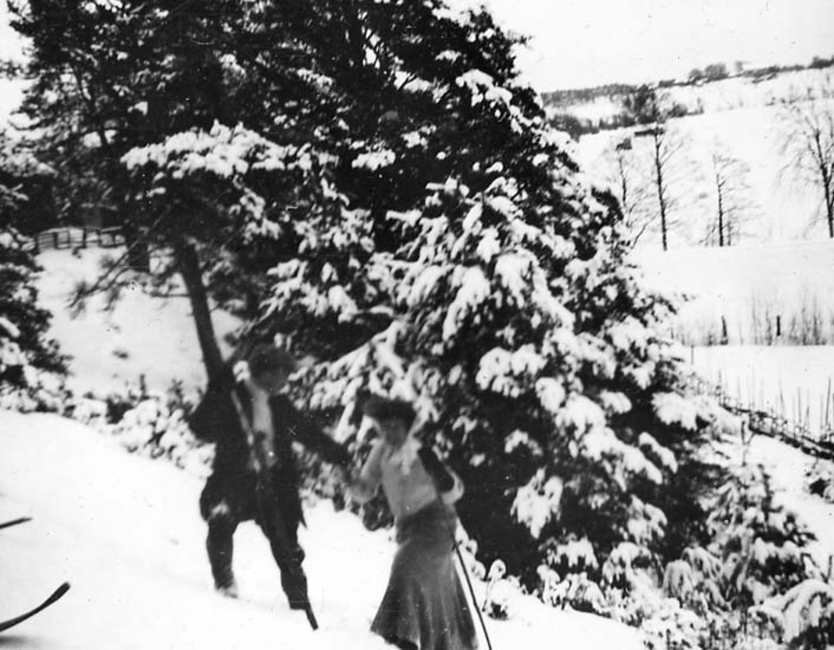 Par på skidtur tar sig upp för en backe