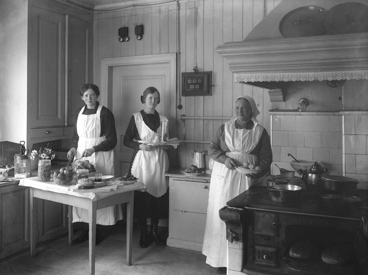 Enligt medföljande noteringar: "Köket. Gamla Fru Johansson gift med kusken på Herrgården o. Fröken Ida Larsson Marie (?) och hembiträdet fröken Rut Löfsten, omkring år 1930?"