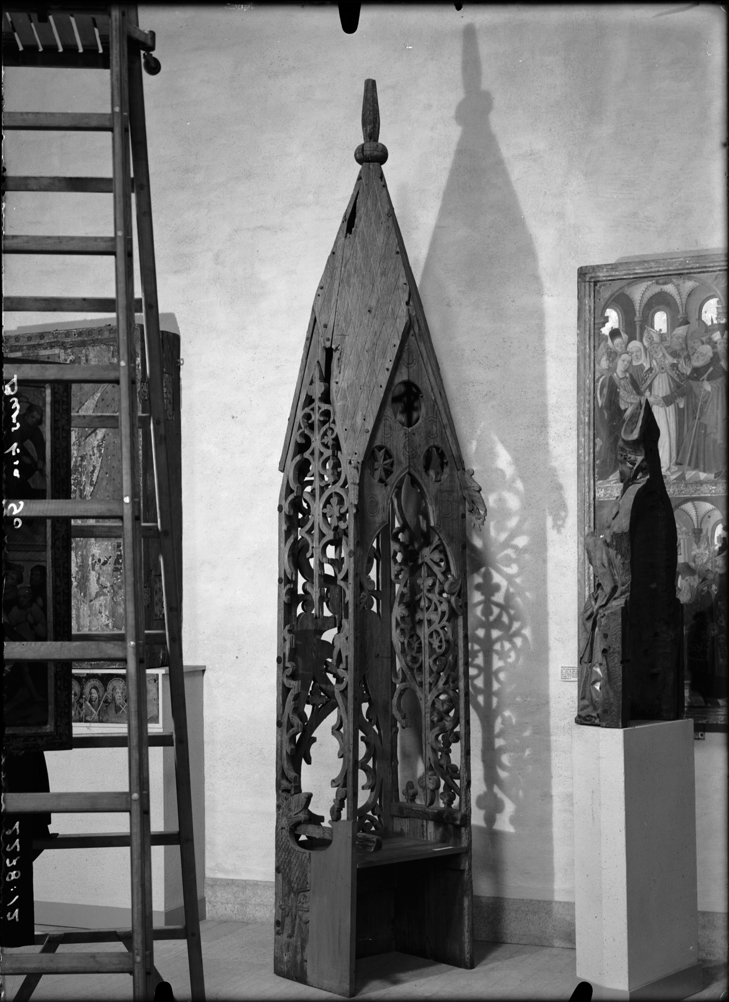 Korstol av furu med rikt snidade gavlar, 1300-tal.