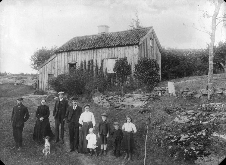 Enligt fotografens noteringar: "Gammal torpstuga för omkring 1910 - ? Munkedal. Munkedals fabriks arbetare. Farfar & Farmor med barnbarn. Vid Nässjön Valbo-Ryr."