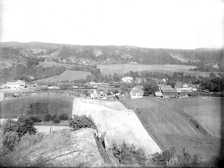 Enligt noteringar: "Munkedals stationssamhälle från 'Vallmans kula'. På åkrarna ligger