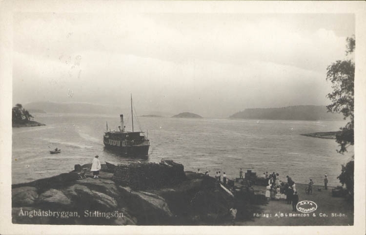 Tryckt text på kortet: "Ångbåtsbryggan, Stillingsön."