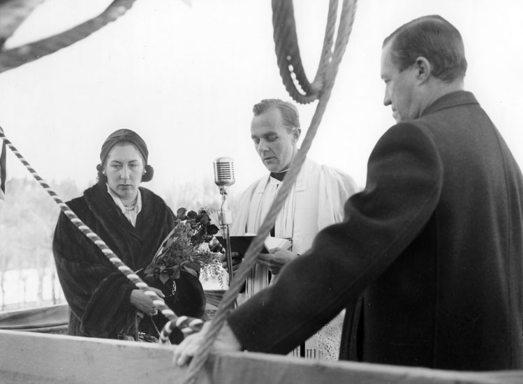 Vid dop och sjösättning av fartyg 125 M/S Point Lacre. Fartygets gudmor med präst och Uddevallavarvets representant.