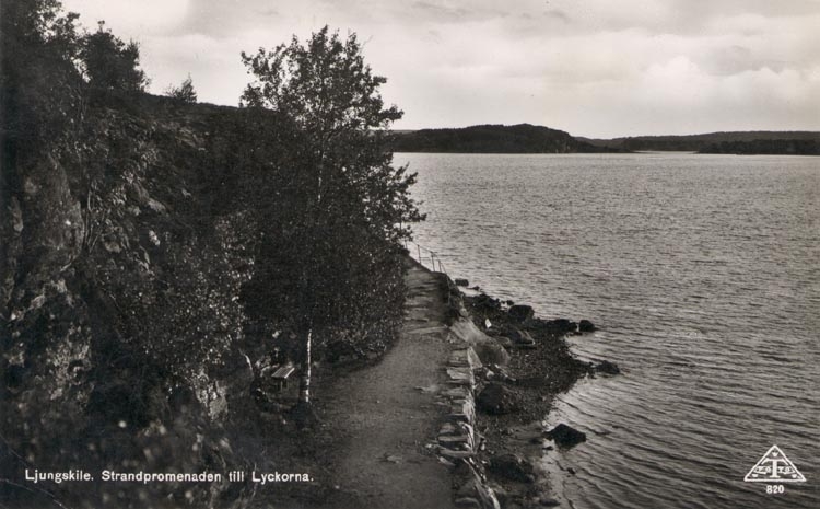 Tryckt text på kortet: "Ljungskile. Strandpromenaden till Lyckorna".