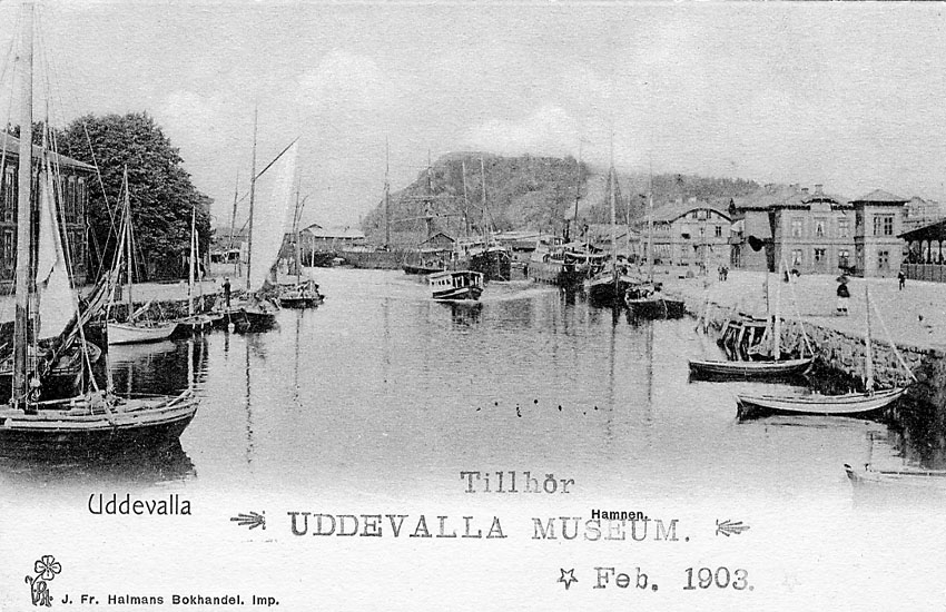 Tryckt text på vykortets framsida: "Uddevalla Hamnen".