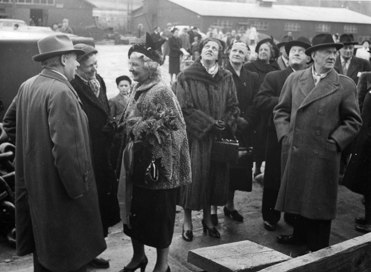 Från dop och sjösättning av fartyg 126 M/T Aslaug Torm. Kvinnan med blombuketten är fartygets gudmor Fru C. Mazanti Andersen.