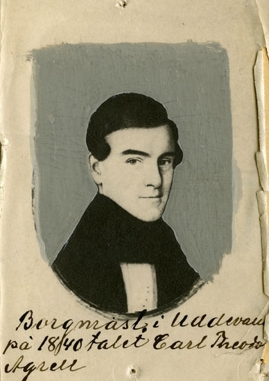 Text på kortets baksida: "Carl Theodor Agrell. Borgmästare i Uddevalla 1842-52 F 1809 D 1852". (Bild efter en miniatyr gjord 1840, tillhör N. Agrell Stockholm).